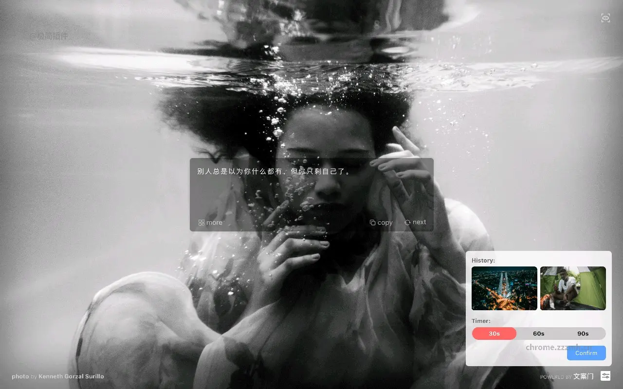 该扩展会在新标签页中展示靓丽的图片及优美的文案,并支持在标签页中快速记录信息。